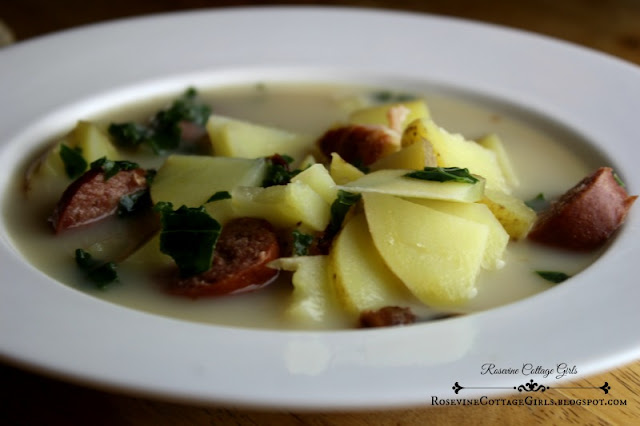 Rinse and chop your kale and then add to your broth to cook.  When tender add the sausage, bacon and milk to your soup.  Cook until warm.